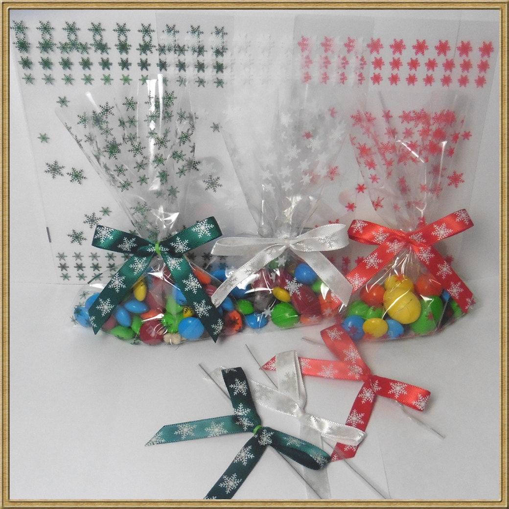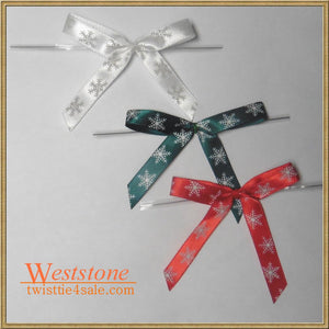 ----Color: SNOW RED, WHITE and GREEN----Twist Ties (Clear): 4" ----Ribbon Width: 3/8"----Bow Width: 2 1/2" ----- Bow Tail: 2"